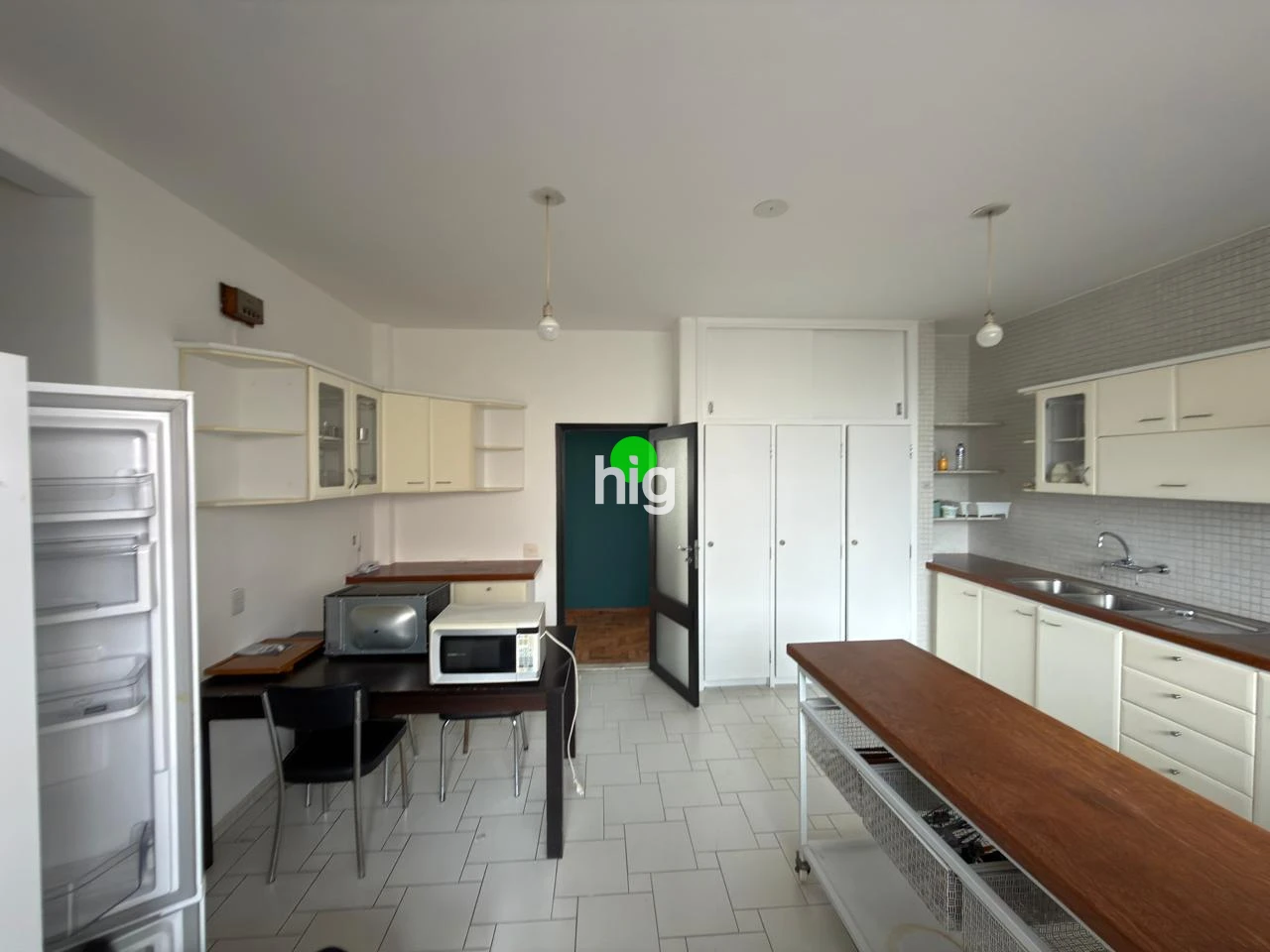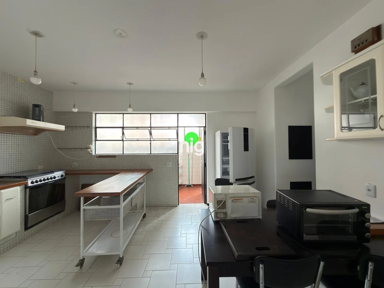 A cozinha conta com bom espaço de bancada e armários, conectando-se à área de serviço. São duas vagas de garagem fixas.
