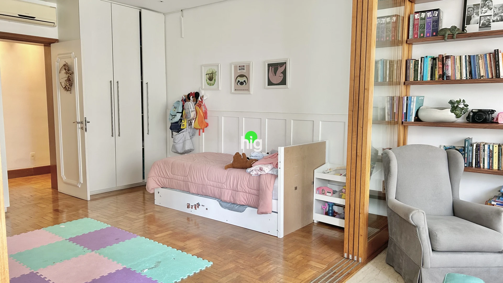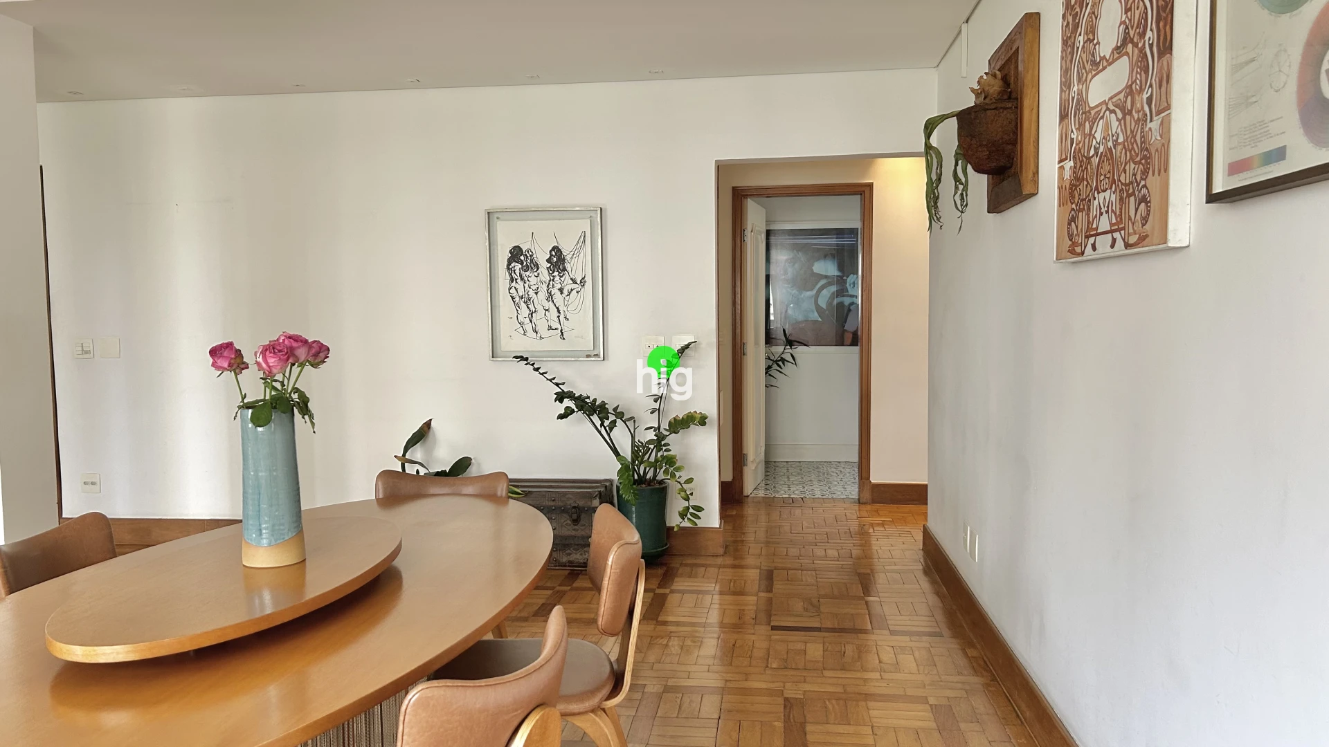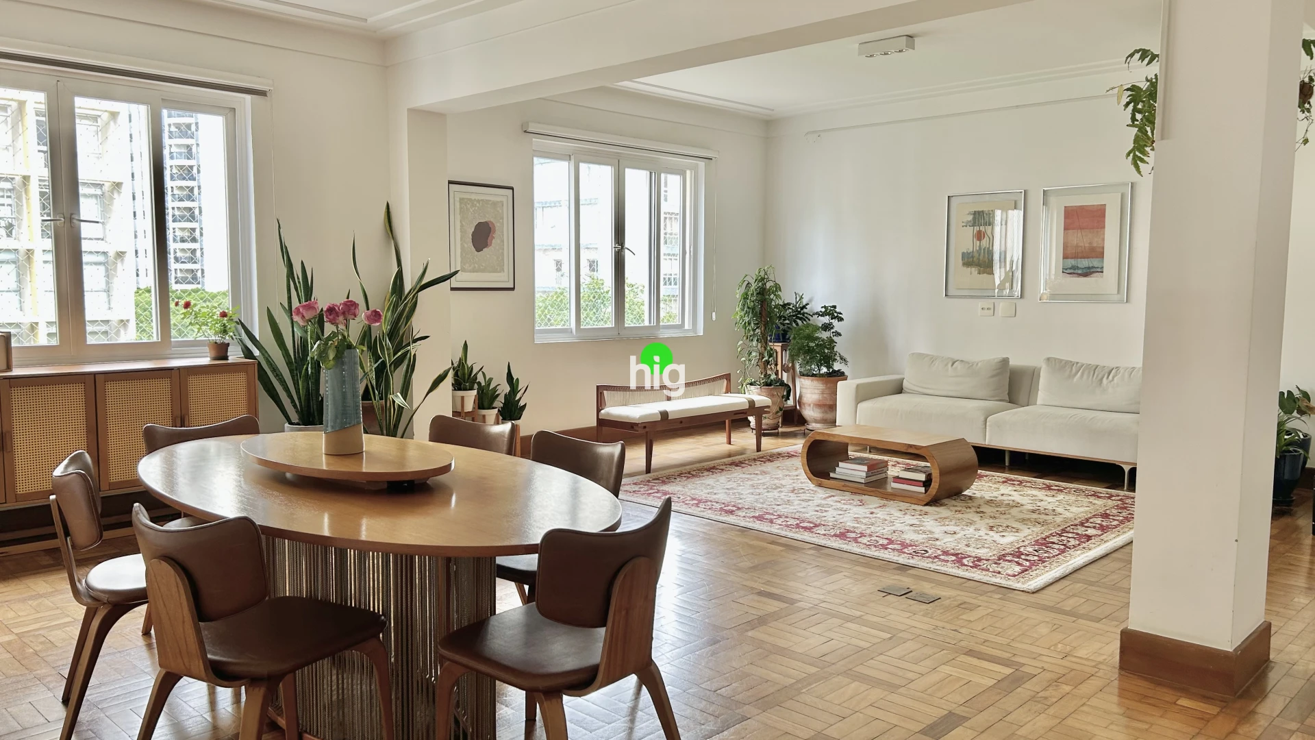 O apartamento está acima da copa das árvores, tem excelente iluminação natural, vista aberta e privacidade. O living amplo para dois ambientes é marcado por janelões com sistema antirruído, pé-direito generoso e taco de madeira original em ótimo estado.