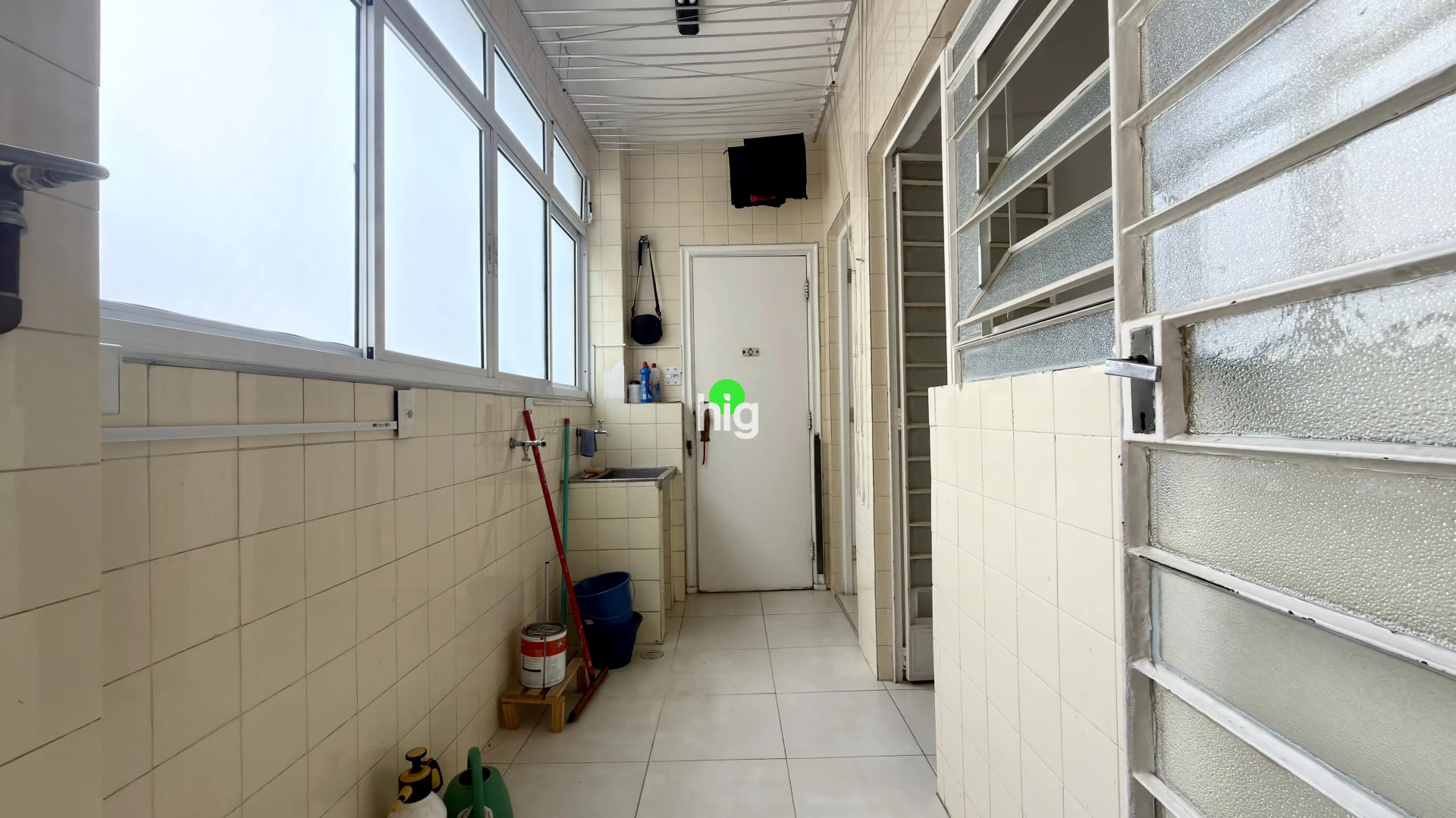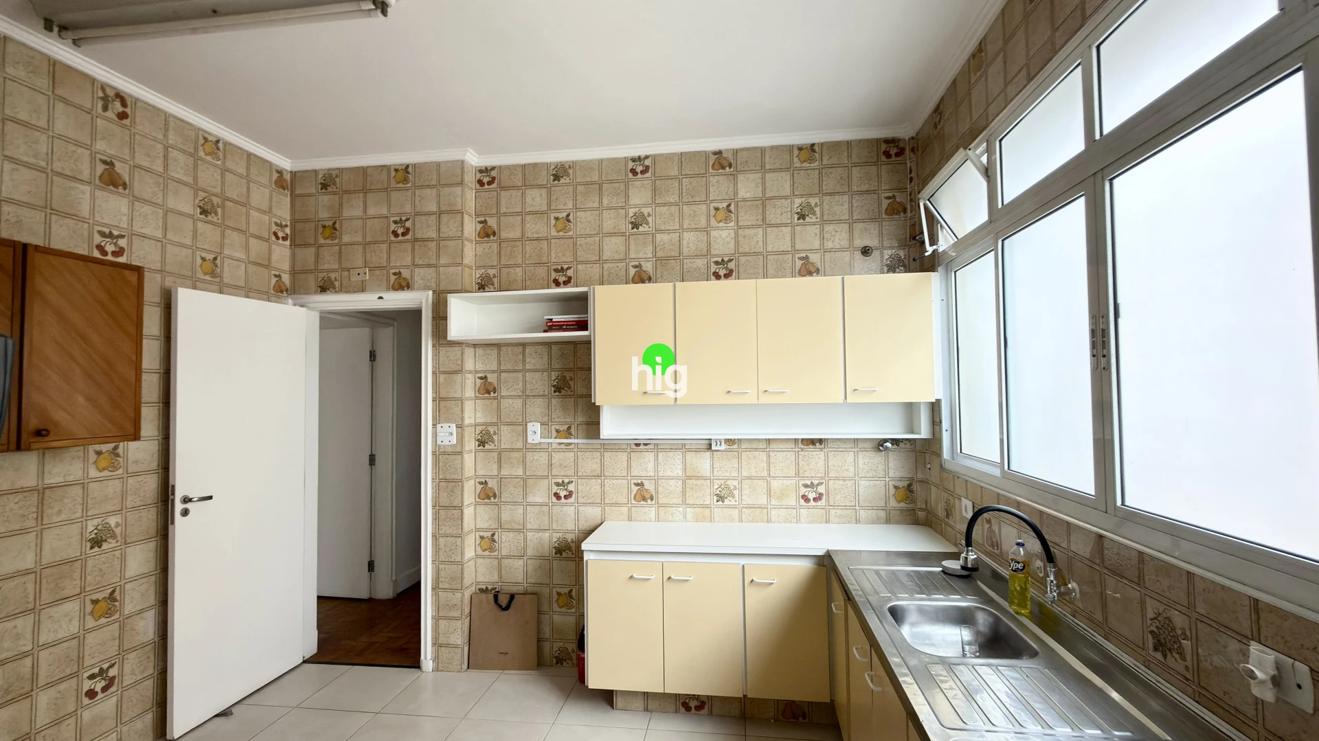 A cozinha é bem ampla e está toda original, com armários embutidos e lavanderia integrada, azulejos hidráulicos coloridos originais e janelas de ferro que são bem características da época, dando mais autenticidade e estilo para o imóvel.